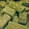 A sun-cured baled hay replacement containing no dyes or preservatives that leaves less waste and yields less dust.